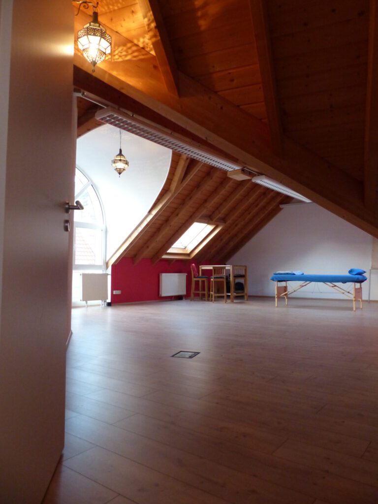 Durch einige Dachschrägen eignet sich der Raum zur Tanz- und Bewegungstherapie nur bedingt . Er ist ca. 50 qm groß, hat einem Vorraum, der sich zur Präsentation von Snacks und Getränken eigent, die Du in der Küche vorbereiten kannst. Gläser, Tassen, Besteck und Geschirr sind vorhanden. Unser Trinkwasser ist schadstofffrei aufbereitet und quellfrisch. Wir haben Yogamatten, Sitze, Kissen, Decken, ferner Behandlungsliegen, Stühle, Tische, Flipchart, Leinwand, einen installierten Beamer (HDMI/DVI) sowie eine Musikanlage, an die Du mit einem vorhandenen 3,5 mm Klinkenstecker zum Beispiel Dein Handy anschließen kannst. Die Wände sind teils verspiegelt, die Du nutzen kannst oder mit einem Vorhang bedeckt lassen kannst.